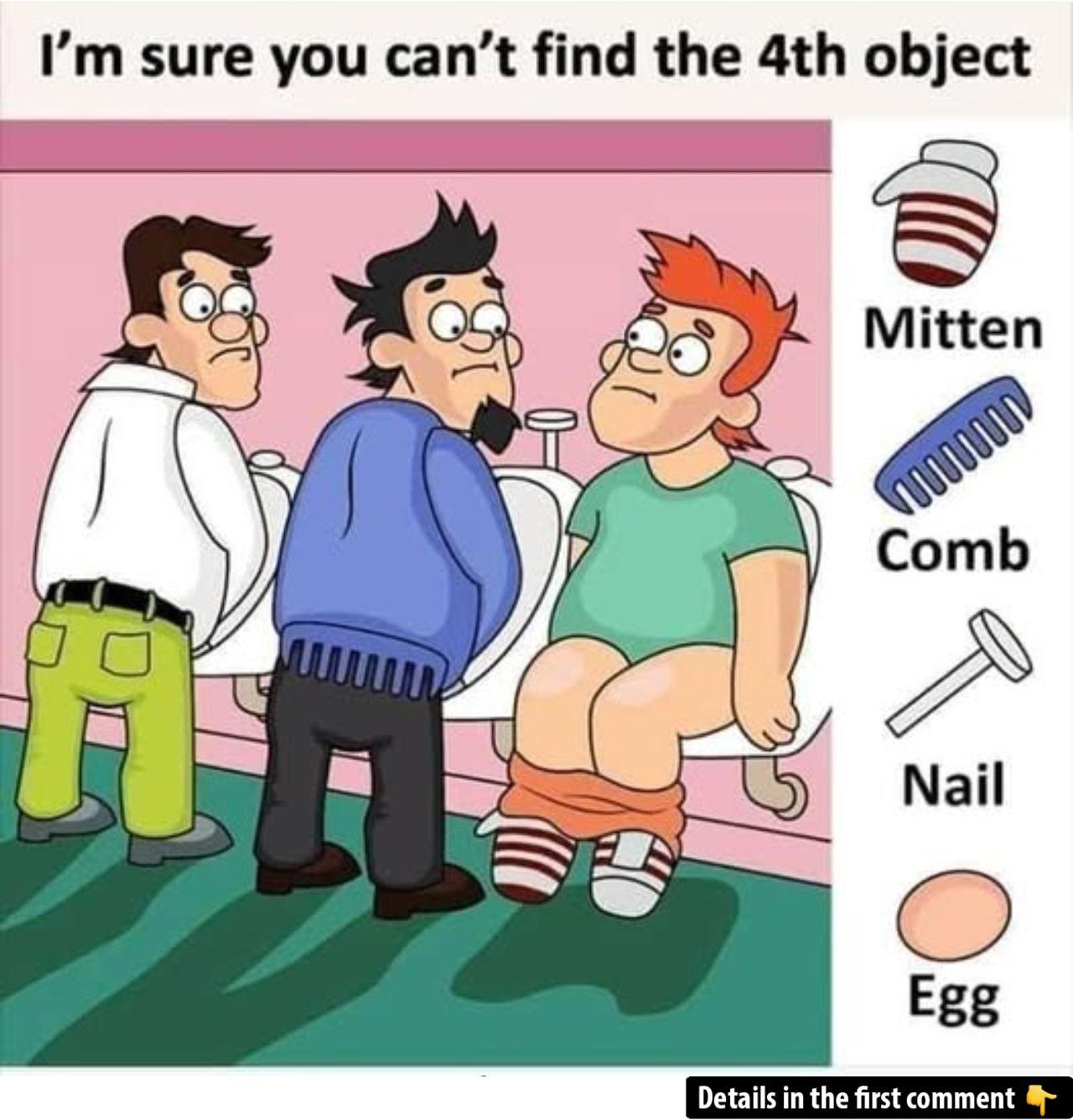 Test your attention to detail with this cheeky restroom scene: three men at the urinals conceal four everyday objects in plain sight—a comb, a nail, a mitten, and an egg. Most solvers glance right past these tiny oddities, mistaking them for wrinkles, levers, or socks. In our step‑by‑step guide, we’ll show you how to methodically scan top‑to‑bottom, left‑to‑right, spot color and shape anomalies, and zero in on each cleverly hidden item. Ready to prove your observational prowess? Dive in, find all four objects, and share your count and detective strategy in the comments!