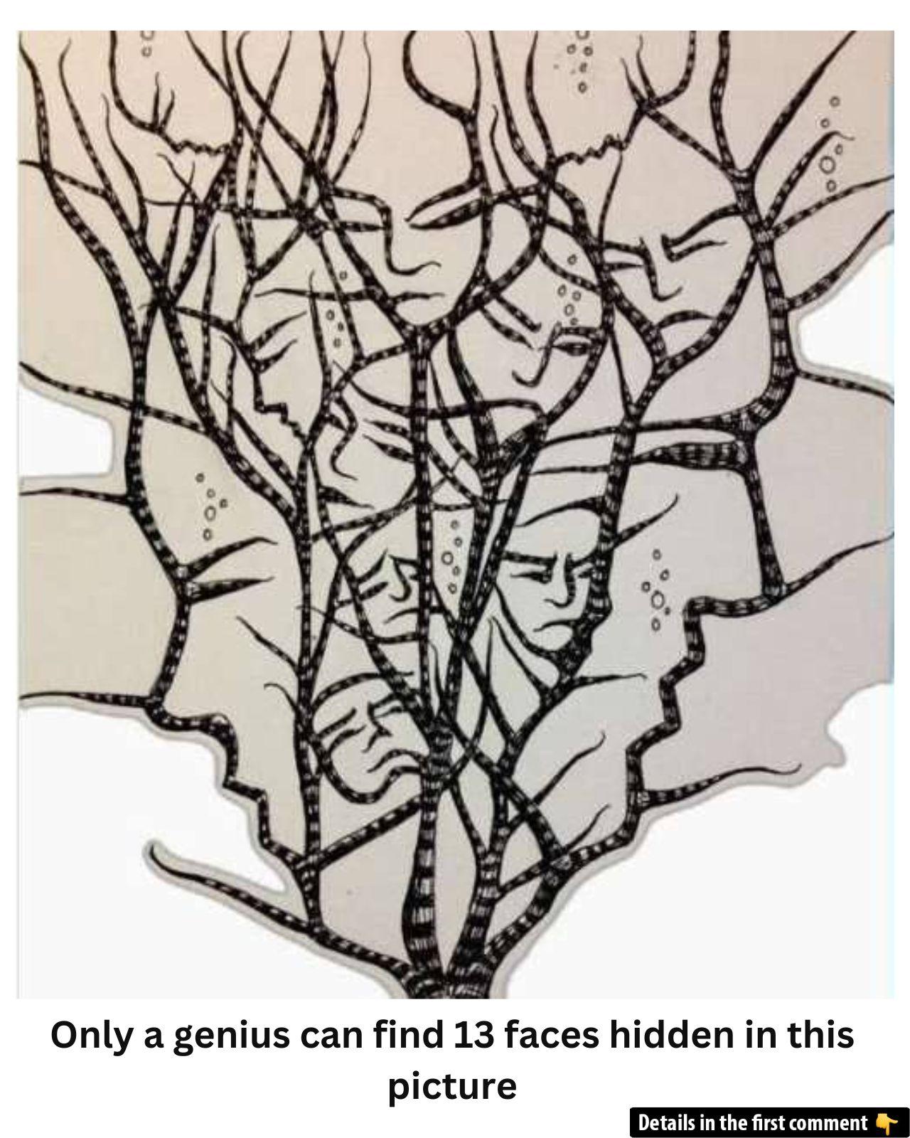 Stare at this intricate drawing of tangled branches for just a few seconds—can you spot the 13 faces cleverly concealed among the lines? Each “face” blends into the maze of strokes, demanding an eagle eye and keen pattern recognition. Before scrolling down, challenge yourself: how many can you find right now?